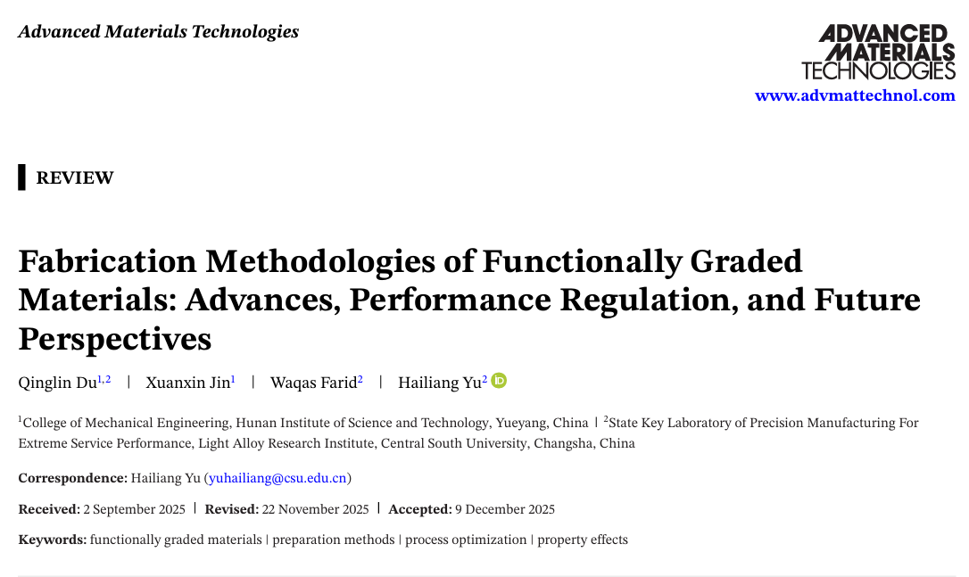 近日,英国威廉希尔公司官网2022级机械设计制造及其自动化专业本科学生金轩信,在杜青林博士的悉心指导下,历时一年完成了综述论文“Fabrication Methodologies of Functionally Graded Materials: Advances, Performance Regulation, and Future Perspectives”成功发表于国际知名学术期刊“Advanced Materials Technologies”(SCI三区,影响因子:6.2)。