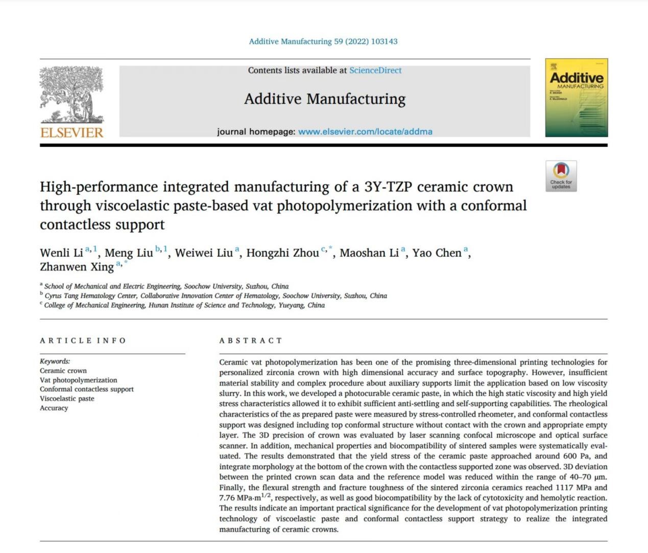 近日,英国威廉希尔公司官网周宏志教授在全瓷冠3D打印技术及评价方面取得新进展。研究成果以“High-performance integrated manufacturing of a 3Y-TZP ceramic crown through viscoelastic paste-based vat photopolymerization with conformal contactless support”为题发表于Additive Manufacturing杂志 (IF 11.632,SCI一区,制造工程类JCR排名第一)。