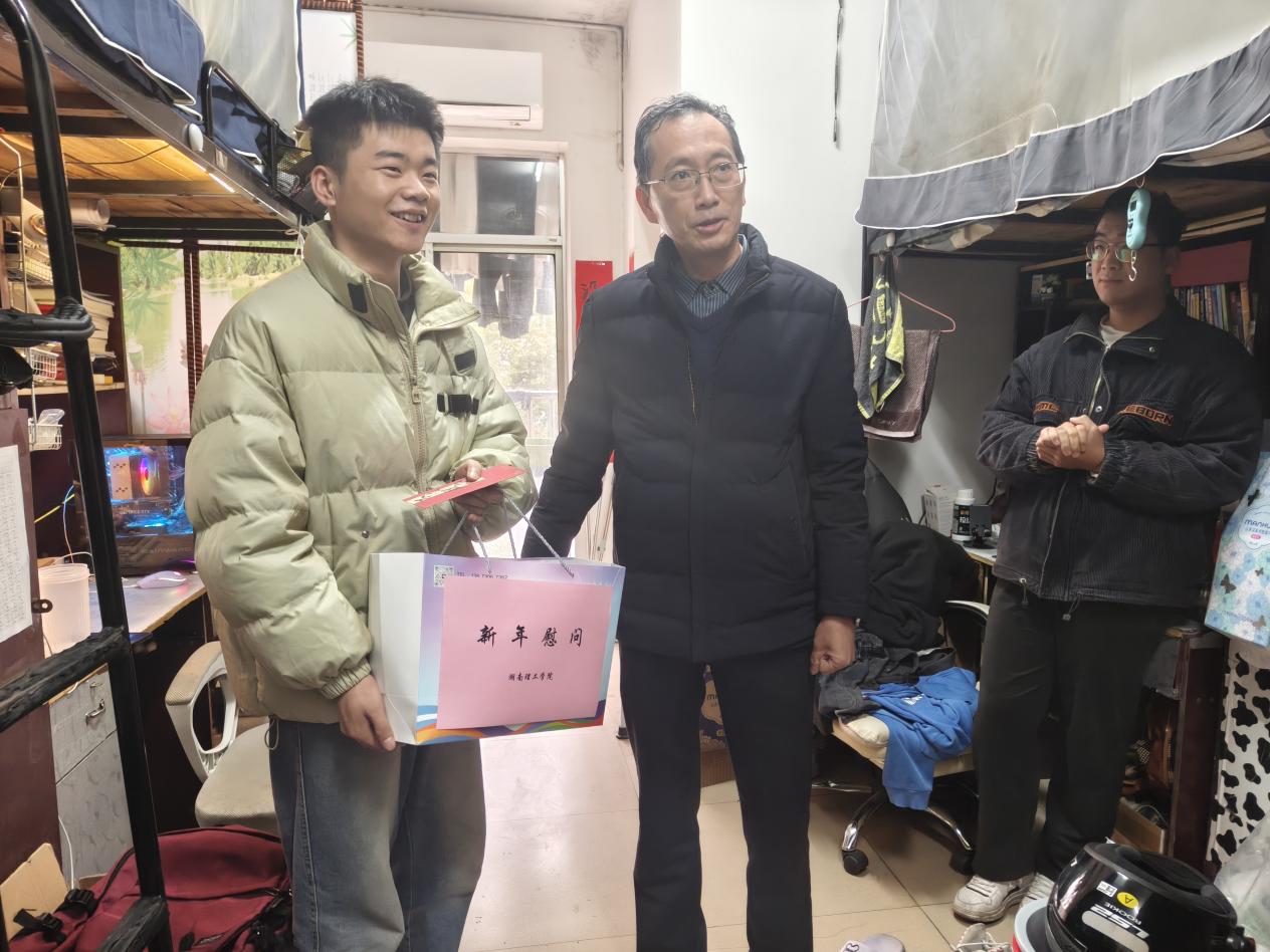 走访中,丁校长将慰问物资亲手送到了困难学生们的手上,同时还细致查看宿舍安全和卫生情况,并嘱咐要注意保暖,合理安排作息,充分利用学校丰富的学习资源,拓展专业视野,丰富校园生活。
