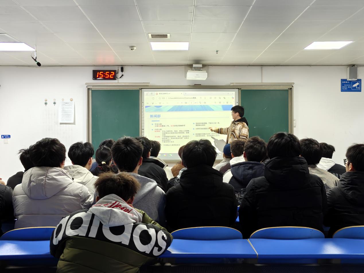 汪俊杰聚焦宣传实务,重点讲解写稿与排版技巧,明确新闻稿标题、导语、主体撰写要求,强调稿件真实简洁、重点突出,同时讲解字体、行距、配图等排版规范,要求成员提升稿件呈现质感,增强传播效果。
